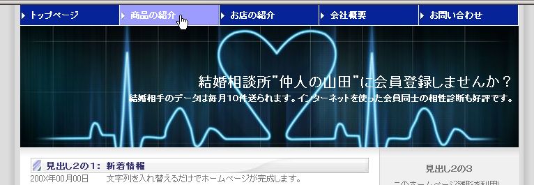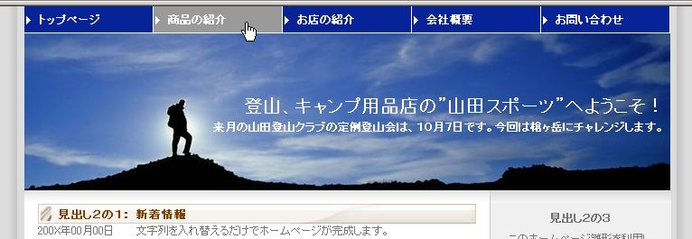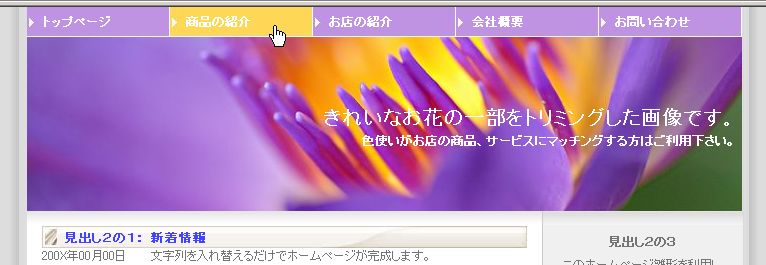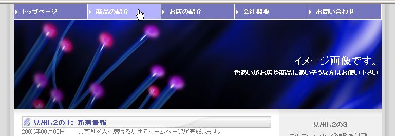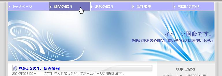 ■ 注意 ■ サンプル画像は見本です。実際のホームページと多少異なる場合があります。 正式にホームページ雛形をお決めいただく場合は、3日間無料体験で現物をご確認下さい。